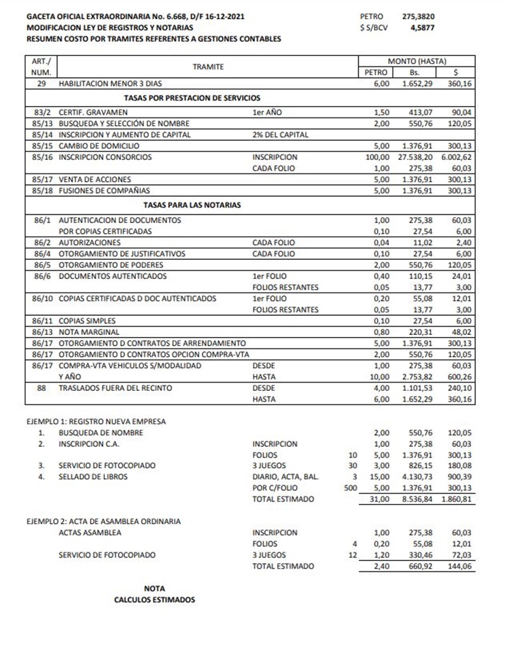 Hasta una unidad de petro (1 PTR) por los recaudos que deben agregarse al cuaderno de comprobantes.