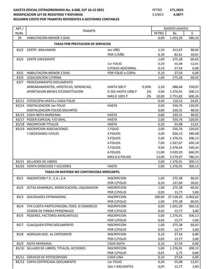 Artículo 85. En materia no contenciosa mercantil se causarán las siguientes tasas a favor del Servicio Autónomo de Registros y Notarías: