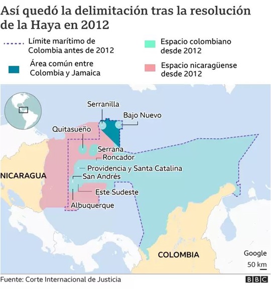 En 2001 Nicaragua puso un reclamo ante la CIJ, pero esta ratificó en 2012 la posesión colombiana del archipiélago. Pero esa misma resolución dio la exclusividad económica a Nicaragua de una parte importante del espacio marítimo que antes pertenecía a Colombia.