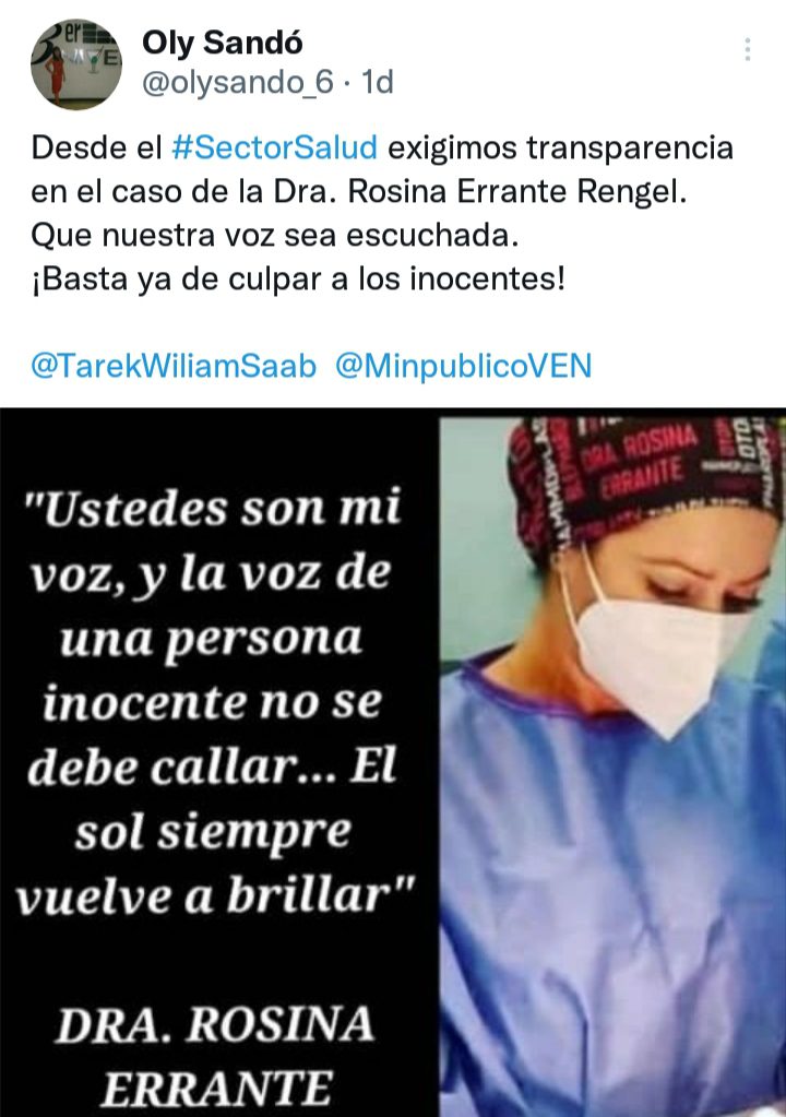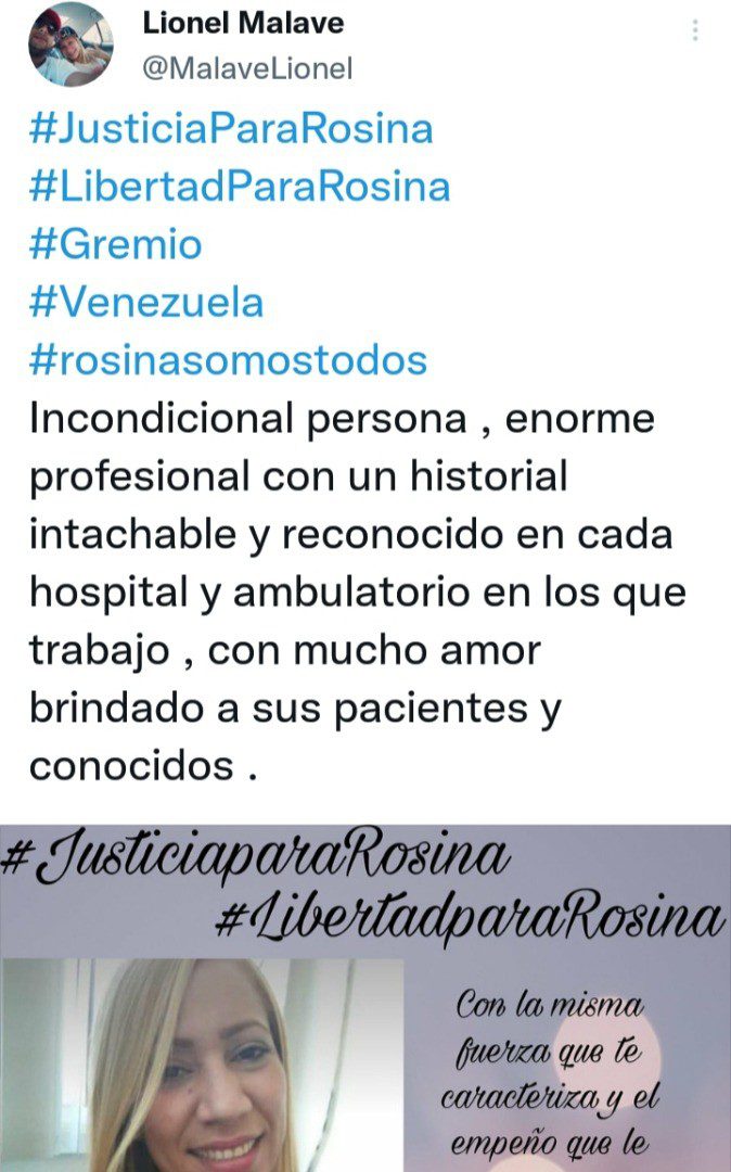 “Todos los médicos debemos unirnos en apoyo para ella porque hoy es la Dra. Rosina Errante. Pero mañana podemos ser nosotros. Los pocos que quedamos en Venezuela, arriesgando todo y así nos pagan. Usándonos con maldad, arruinandonos la vida #JusticiaParaRosina”, agregó la usuaria de Twitter, Katherine Robles.
