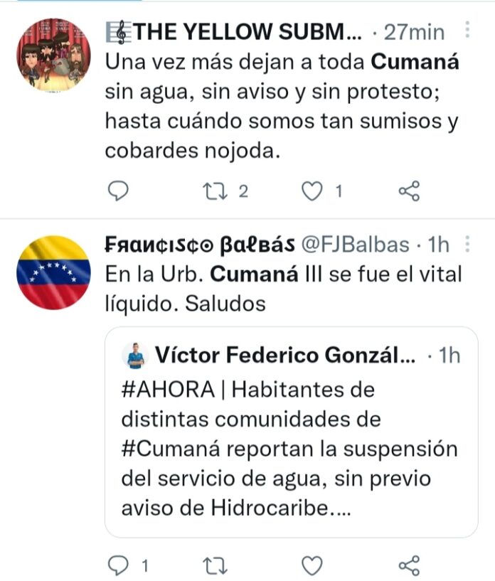 Usuarios de la red social Twitter denunciaron el corte en el suministro de agua potable en Cumaná, estado Sucre, por parte de la Hidrológica del Caribe (HidroCaribe), quienes hasta el momento no han dado respuesta sobre la situación de manera oficial.