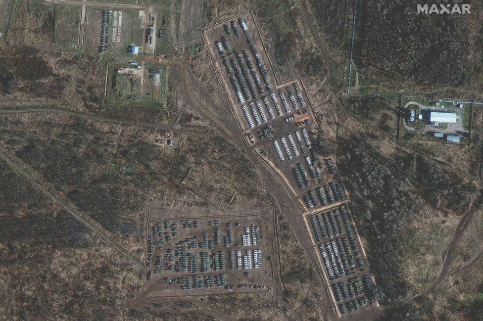 Esta concentración de tropas rusas se vio a unos 300 km de Ucrania. Crédito: Maxar