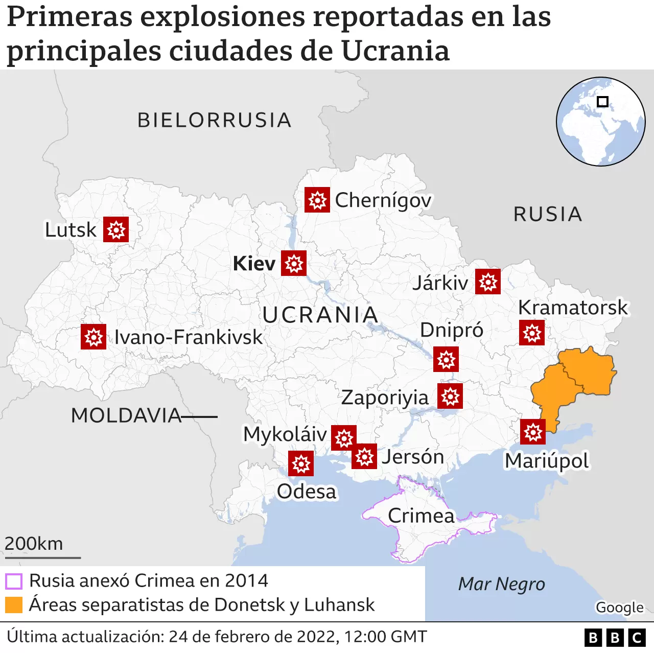 Las fuerzas rusas han atacado Ucrania por el este, donde se encuentran las regiones rebeldes de Donetsk y Luhansk, pero además han atacado desde el sur, desde Crimea, una península de Ucrania que Rusia se anexó en 2014; y desde el norte, donde se cree que las tropas rusas cruzaron por la triple frontera en la que coinciden Rusia, Ucrania y Bielorrusia.
