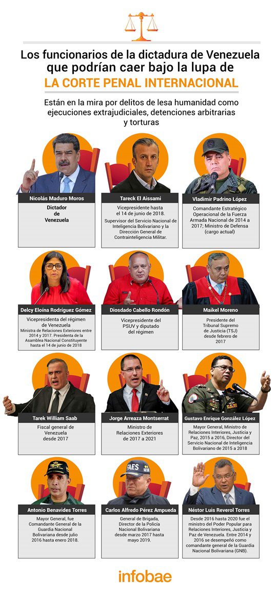 Según la misión especial de la ONU para Venezuela liderada por Michelle Bachelet, que recomendó en repetidas oportunidades la intervención de la CPI, “las autoridades y las fuerzas de seguridad venezolanas han planificado y ejecutado desde 2014 graves violaciones a los derechos humanos, algunas de las cuales –incluidas las ejecuciones arbitrarias y el uso sistemático de la tortura– constituyen crímenes de lesa humanidad”. “Lejos de ser actos aislados, estos crímenes se coordinaron y cometieron de conformidad con las políticas del Estado, con el conocimiento o el apoyo directo de los comandantes y los altos funcionarios del gobierno”, agregó la presidenta de la misión, Marta Valiñas.