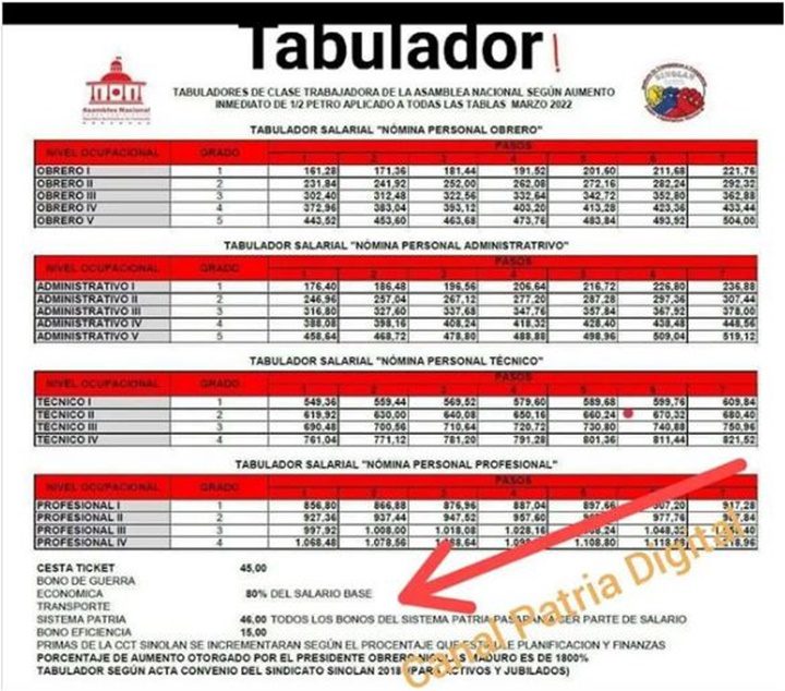 Este domingo, fue publicado el tabulador con los supuestos sueldos que ganarían los trabajadores de la Asamblea Nacional (AN) para el mes de marzo de 2022, tras el incremento del salario mínimo a medio petro.