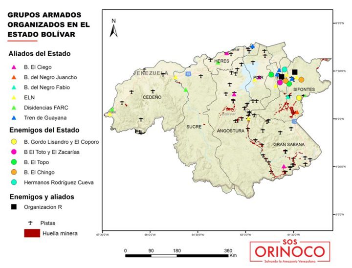 Entre ellos, se incluyen los llamados “sindicatos mineros” -por su origen- hoy convertidos en bandas criminales (ver capítulo 3 del informe de SOS Orinoco), los “pranatos” (grupos criminales liderados por presos desde la cárcel), las mega-bandas y los guerrilleros de origen colombiano, como el ELN y las disidencias de las FARC. El periodista venezolano Germán Dam los ha retratado en innumerables ocasiones, a pesar de la dificultad que entraña captar la instantánea.
