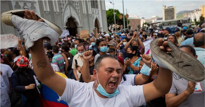 Un hombre grita consignas con sus zapatos rotos en las manos durante una protesta de trabajadores de la Salud. Pablo Zambrano, presidente de la Fetrasalud, destacó que los empleados sanitarios se sienten “decepcionados, menospreciados, humillados y burlados” por los recientes acuerdos de algunas federaciones del sector salud y el Gobierno de Maduro