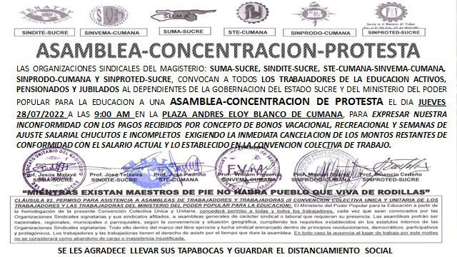 Este jueves 28 de julio marcha y protesta el Magisterio Sucrense por el incumplimiento de régimen de Maduro con los maestros de Venezuela