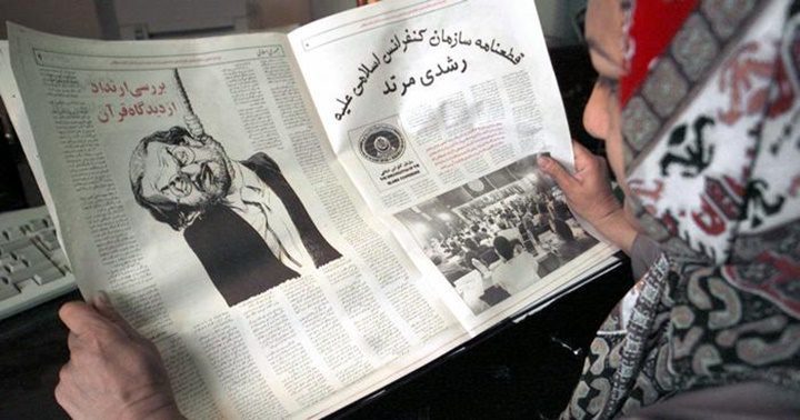 Una mujer lee un periódico iraní del año 2000, que muestra a Rushdie como un hombre colgado de una horca, luego de que las autoridades afirmaran que la fatua en su contra seguía vigente.
