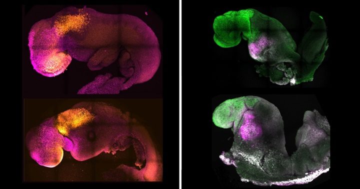 Y con un cerebro más desarrollado. En las dos imágenes: embriones naturales (arriba) comparados con los embriones sintéticos.