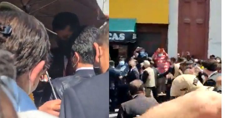 Las imágenes mostradas por Canal N dan cuenta de que seguridad del Estado lo cubrieron con un paraguas y lo limpiaron de las manchas provocadas por las agresiones.