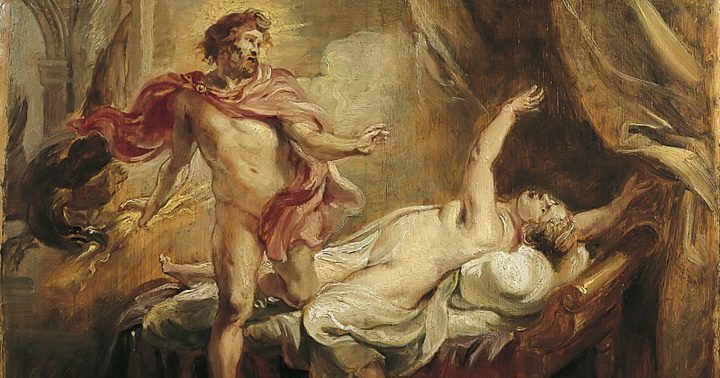 Sémele era una humana que concibió a su hijo en brazos del dios del cielo. Pero la mortal amante no pudo soportar la relampagueante majestad del dios. En la tormenta le trajo a ella la muerte, parió prematuramente a un niño que habría de convertirse en un gran dios. Y por ello, porque como humana había sido demasiado débil, tuvo que apiadarse el padre del hijo y completar la obra de la madre fallecida mediante un segundo nacimiento. (Otto, Ob. cit., p. 58)