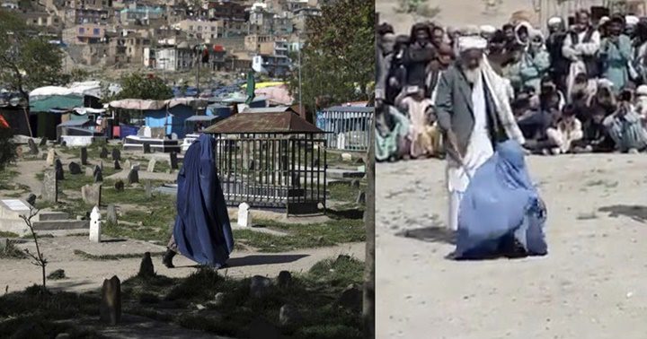 Una mujer en Afganistán es golpeada en público por hablar con un hombre por teléfono.