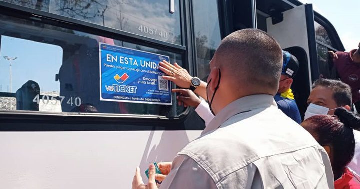 En esta unidad puedes pagar tu pasaje con el bolívar digital, se lee en una calcomanía rectangular de color azul que desde hace meses exhiben autobuses y jeeps que prestan servicio de transporte público en la ciudad. El mismo adhesivo invita al usuario a descargar y usar su código QR y asegura que con el sistema VeTicket, Venezuela avanza a la economía 100 % digital.