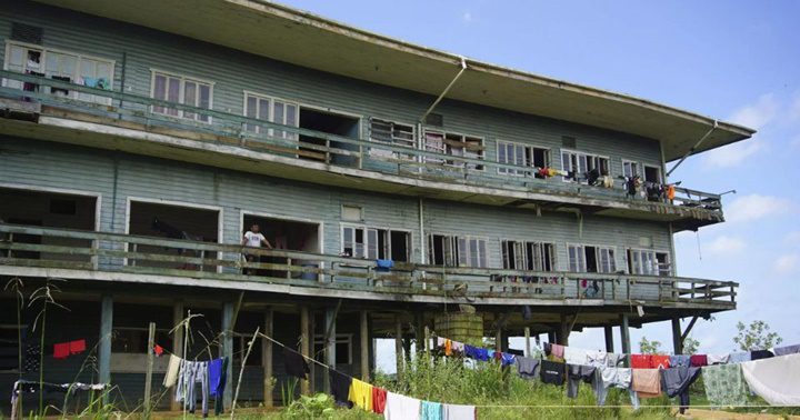 Muchos inmigrantes venezolanos habitan en la «casa verde», un enorme edificio abandonado por una empresa china en Port Kaituma.