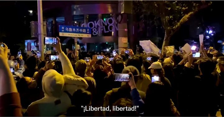 “¡Queremos libertad!”, “¡Abrid China!”, son algunas de las proclamas de los manifestantes, concentrados tras la muerte en Xinjiang de una decena de personas por un incendio en un edificio en confinamiento. Protestas de Shanghái contra la política de cero covid, este sábado por la noche.