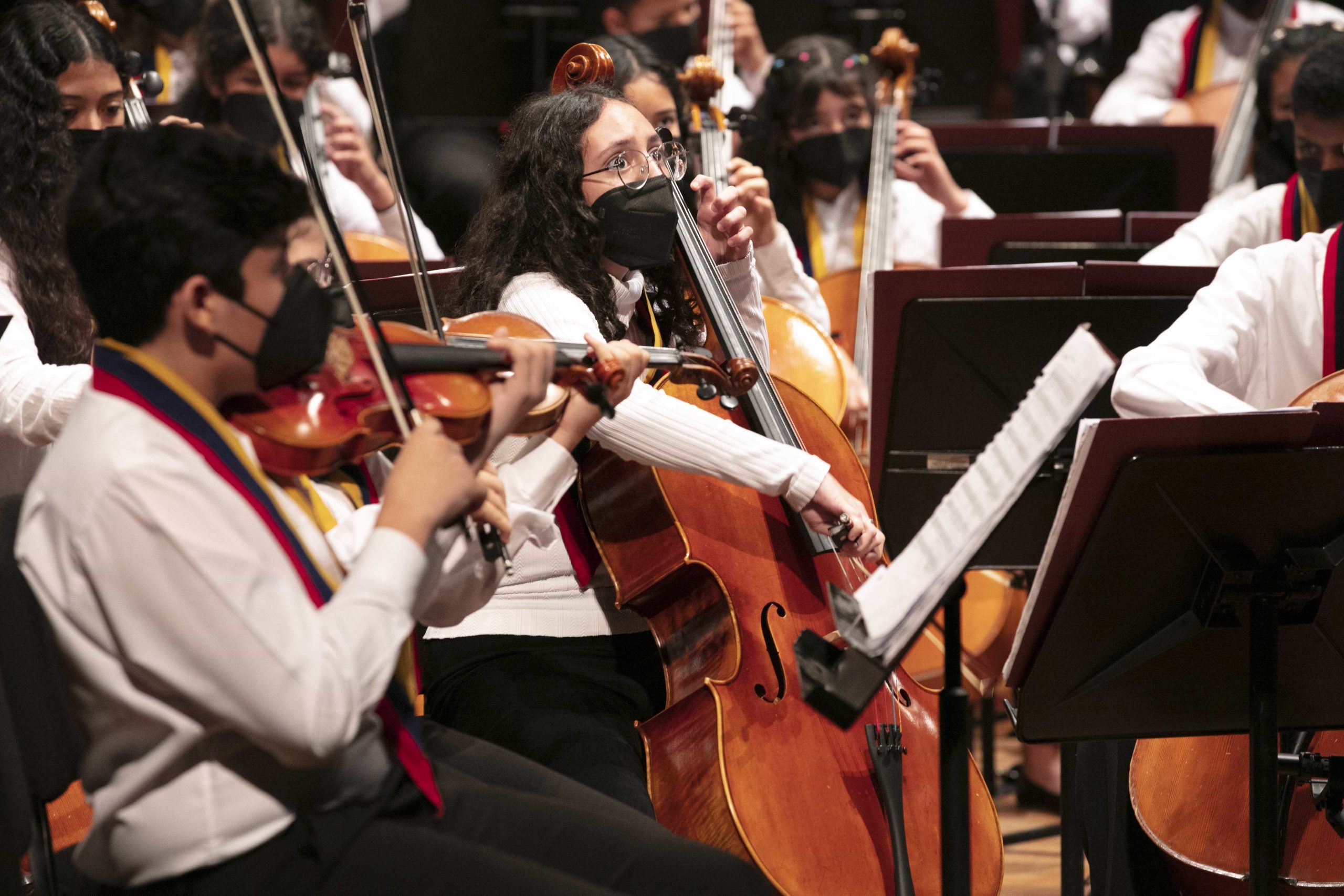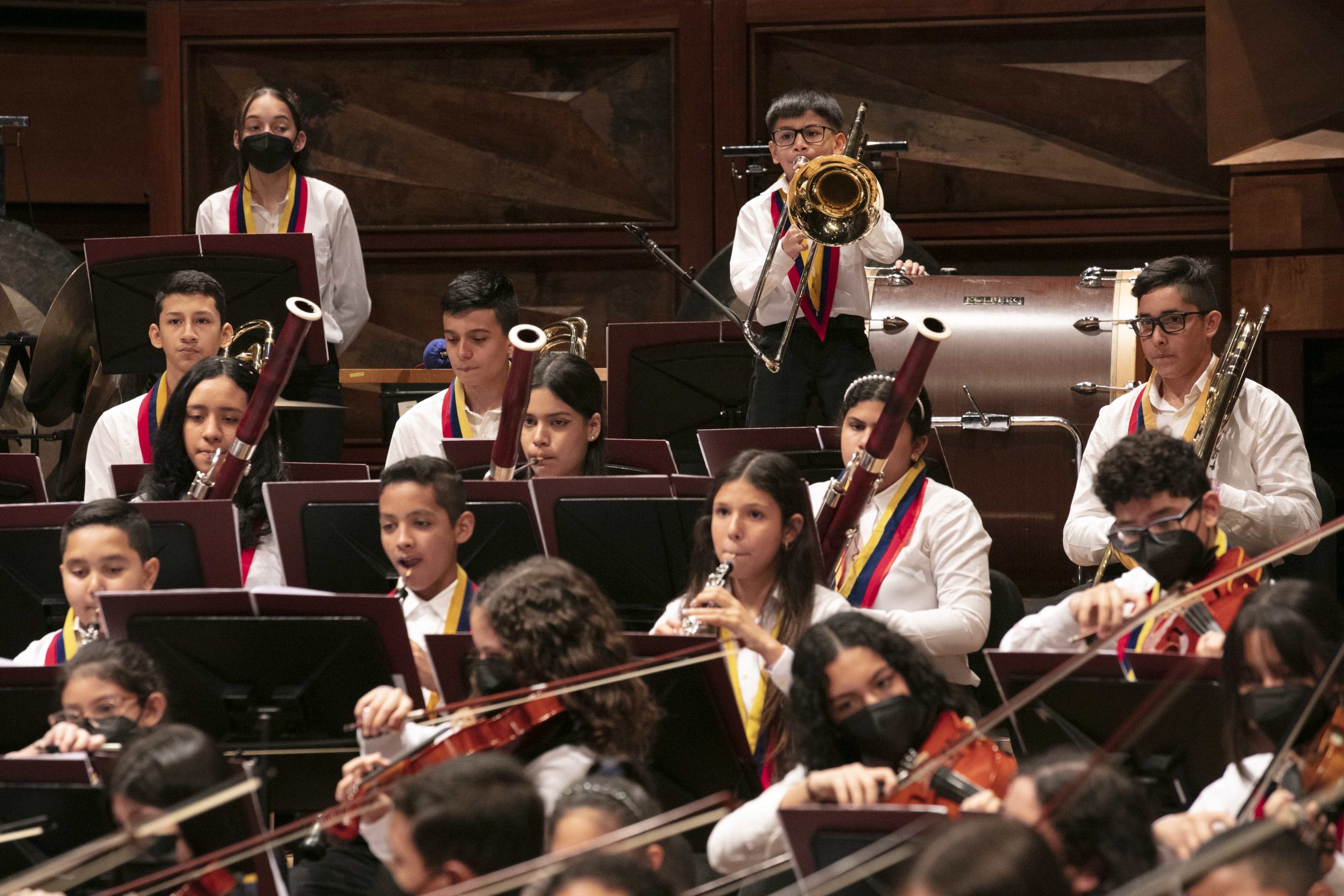 No es raro que el personal de protocolo de El Sistema esté desplegado y ordenadamente se llenen las 888 butacas de la Sala Simón Bolívar en su sede de Quebrada Honda. Tampoco lo es que, detrás del escenario, jóvenes hagan filas para sentarse frente a un atril. Lo inusual es el día: es miércoles 5 de octubre, mitad de semana. A las 11:30 am, los protagonistas entran a escena. 165 jóvenes, todos de pantalón negro y camisa blanca, con una cinta tricolor alrededor del cuello, conocida internamente como la Condecoración Tocar, Cantar y Luchar.