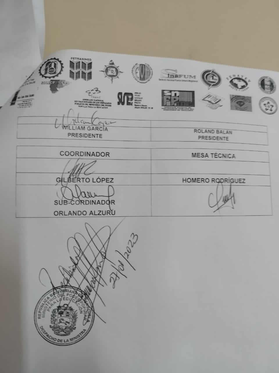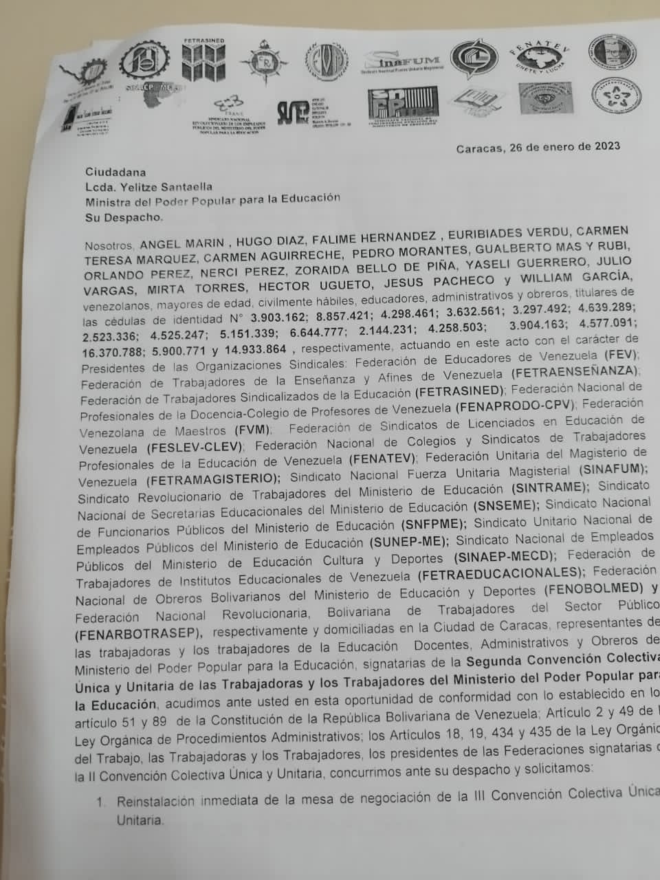 Fetrasined a través de su presidente profesor Falime Hernández presentó a la opinión pública el documento suscrito por las 17 Federaciones y caja de Ahorro, el día de ayer 26-01-2023 y entregado hoy 27-01-2023 a la Ministra de Educación con su propia firma de recibido, cuyo contenido se explica por si sólo y las Federaciones Signatarias de la II CCUU y Presentantes de III CCUU.