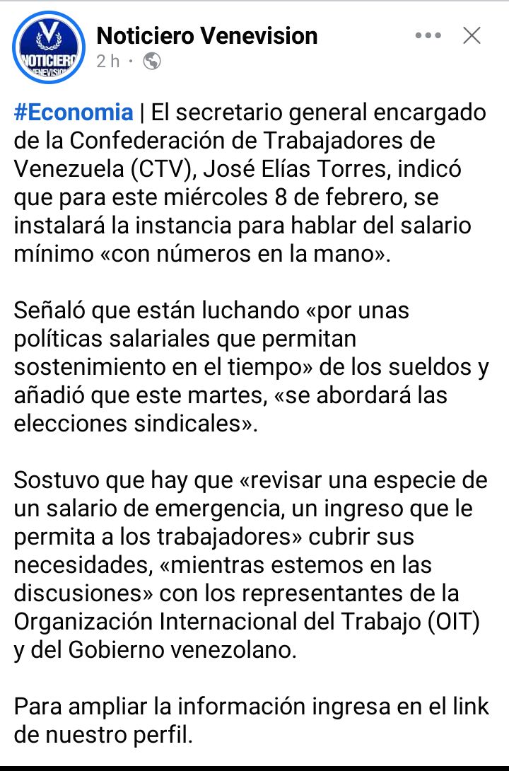 El anuncio lo realizó el Secretario General encargado de Confederación de Trabajadores de Venezuela (CTV) Elías Torres, quien señaló que el gobierno de Maduro se comprometió para sentarse este miércoles 8 de febrero con los números en las manos….Que Dios nos agarre confesados.