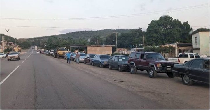 Cola de vehículos esperando para surtir gasolina en Puerto Cumarebo, estado Falcón