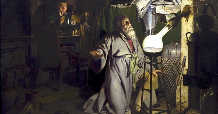 El alquimista, en busca de la piedra filosofal, descubre el fósforo y reza para que su operación concluya con éxito’, de Joseph Wright de Derby (1734-1797).