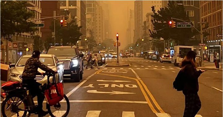 En Nueva York, la estatua de la libertad y los rascacielos de Manhattan se encuentran cubiertos con una neblina naranja y café, mientras que las máscaras, vestigios de la pandemia, reaparecen en las calles.