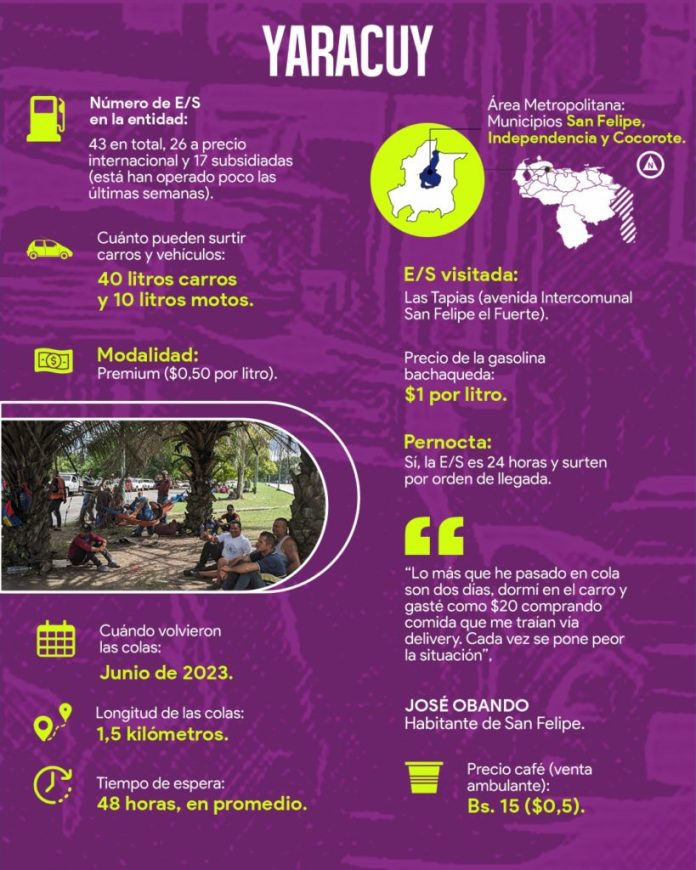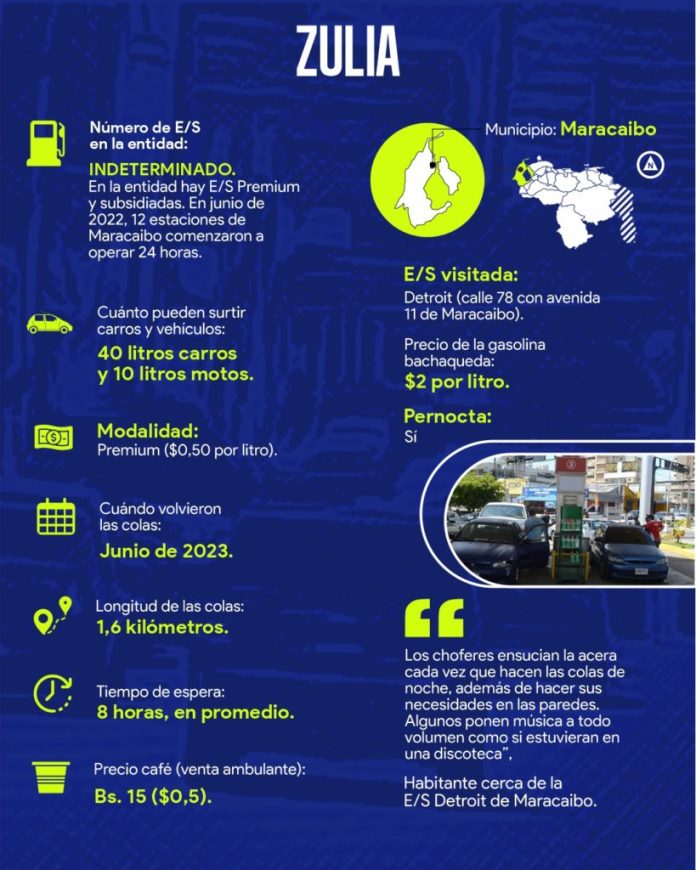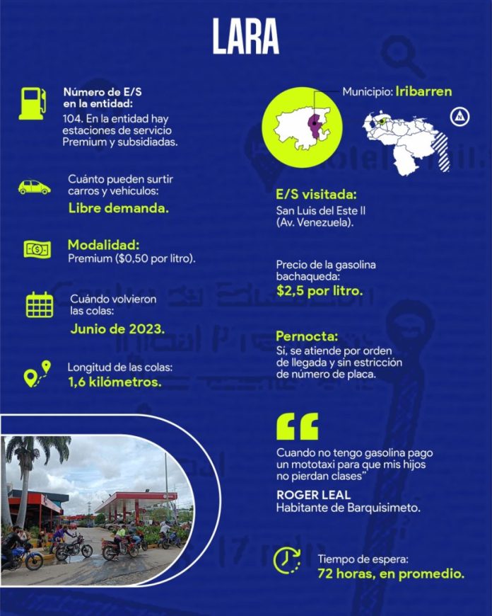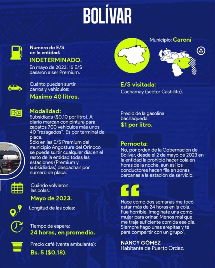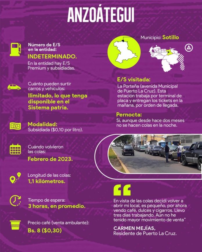 En estados como Anzoátegui, Bolívar, Falcón, Lara, Monagas, Táchira, Yaracuy y Zulia el tiempo de espera en las estaciones de servicio va desde tres hasta 72 horas, sobre todo a partir de junio cuando la situación se agravó, aunque en algunos casos como Monagas, ya era complicada desde finales del año pasado.