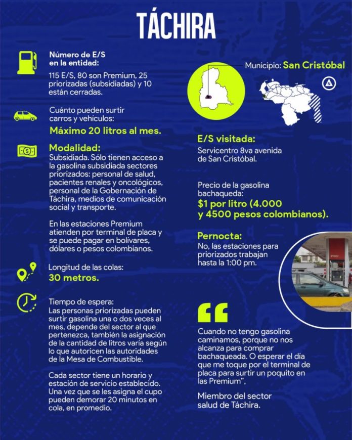 También es frecuente ver como en los alrededores de las estaciones de servicio algunas personas se saltan la cola y pagan hasta 20 dólares e ingresan a las gasolineras, muy cómodamente, para tanquear, reseña una nota de El Impulso.En Táchira debido a los cupos semanales, en caso de que se queden sin gasolina, los conductores deben para el carro y esperar la semana siguiente para volver a surtir. «Caminamos porque no nos alcanza para comprar bachaqueada».