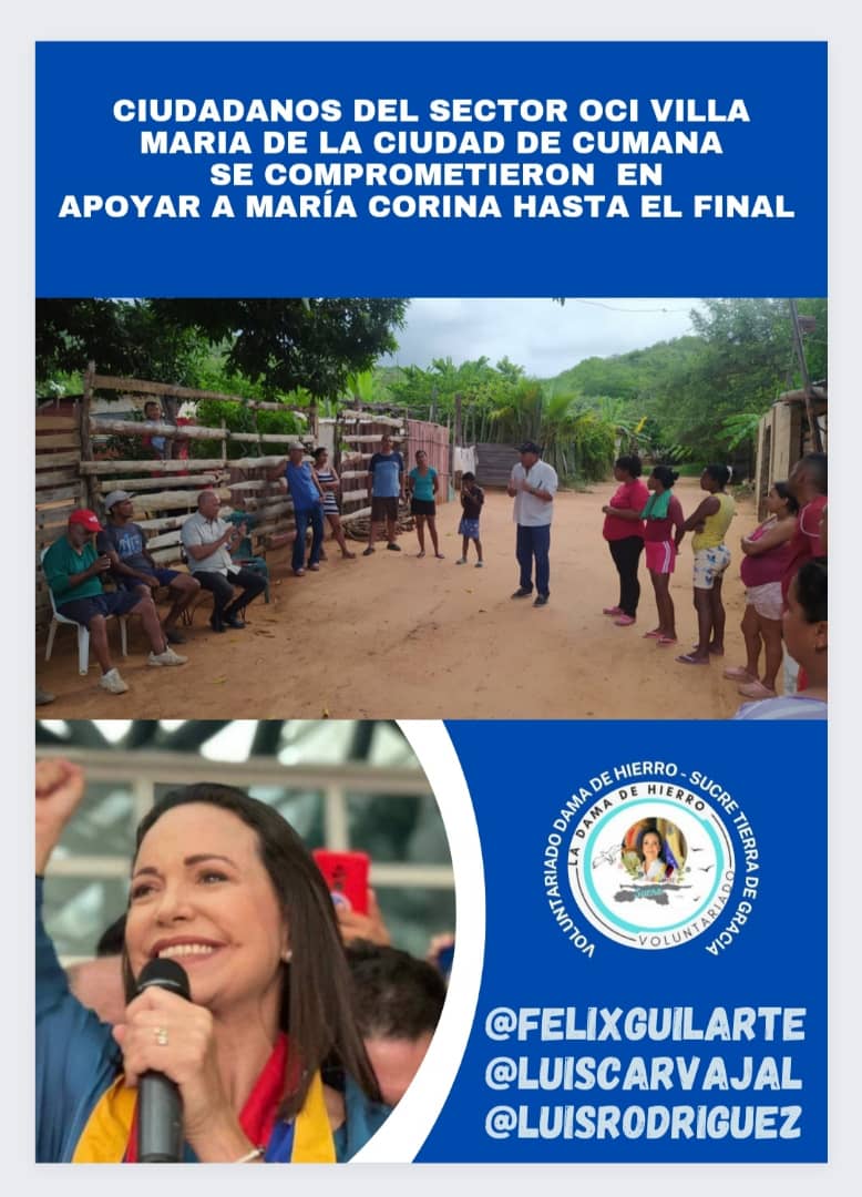 En una reunión convocada por el Voluntariado “Dama de Hierro Sucre Tierra de Gracia”, habitantes de esta comunidad, asentada hace más de 5 años al borde del kilómetro 60 de la Autopista “Antonio José de Sucre”, en la ciudad de Cumaná, a escasos metros de la Urbanización “Luis Mariano Rivera” en el mismo perímetro, se llevó efecto el encuentro, en el cual, los vecinos ratificaron lo que casi toda Venezuela confirma, “ir hasta el final con María Corina”, por no aguanta más, este régimen, mismo, que lo consideran un suplicio.