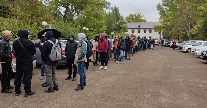 Refugiados rusos esperan ser registrados como migrantes en Kazajistán.