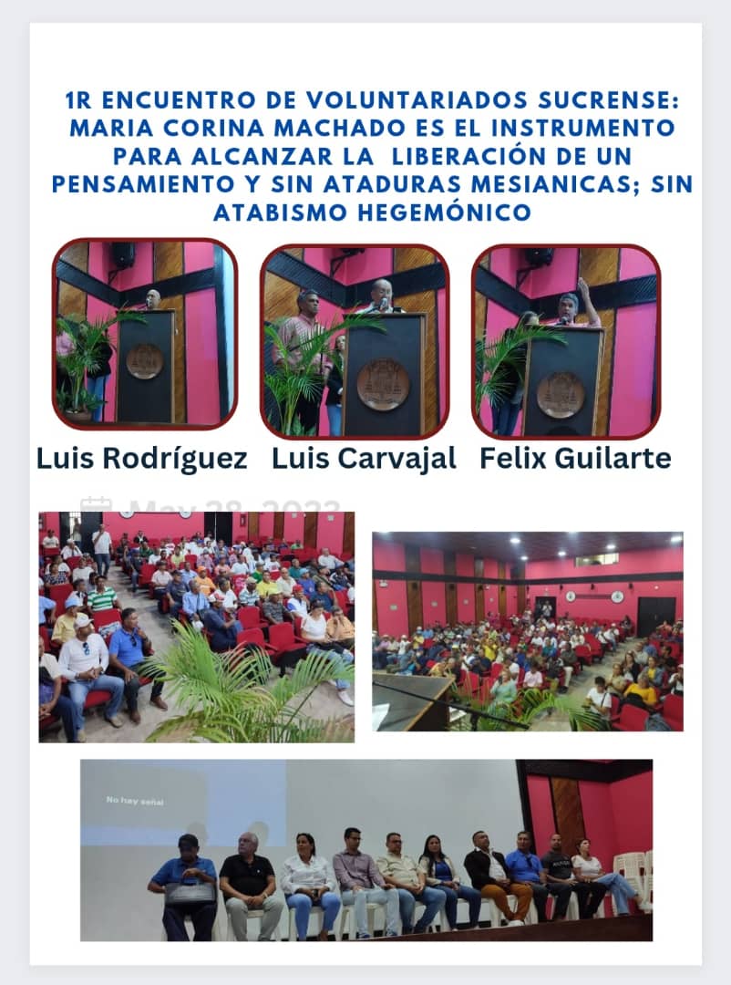 Los voluntariados que se organizaron en el Estado Sucre a través de Vente Venezuela asumieron el compromiso de llevar adelante el enlace con la Sociedad Civil que viene acompañando la cruzada liberatoria que ha emprendido el nuevo movimiento y liderazgo opositor que dirige María Corina Machado hacia el 2024 para defenestrar el desastre y la tiranía “Chavista” que durante 24 años ha creado un holocausto al país, han lanzado una proclama donde detallan y expresan la imperiosa necesidad que tenemos todos los venezolanos, sin distingo de acudir al encuentro con los planeamiento de esta mujer, para alcanzar los logros más urgentes catalizar una sociedad, que como la “nuestra” requiere de progreso, reconciliación, justicia y paz.