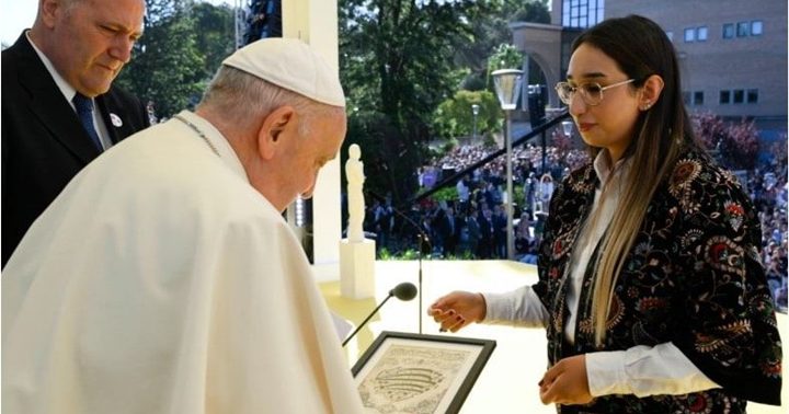 La joven estudiante de 25 años, Mahoor Kaffashian, traslada al Papa cómo ha aprendido la virtud de la fortaleza a través de su complicada vida: “Tengo fe, fuerza y coraje”. Nacida en Irán, fue refugiada en Ucrania, donde le sorprendió la guerra.