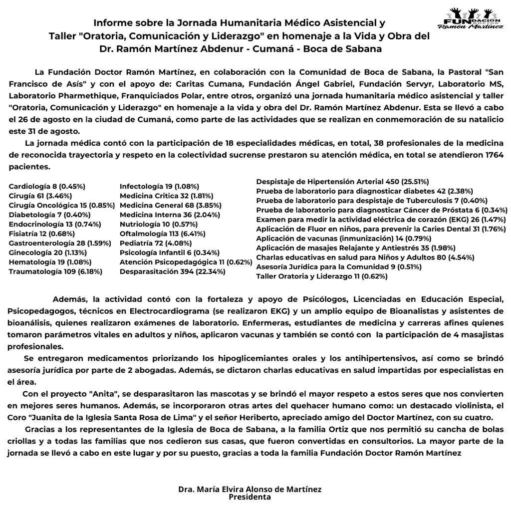 La información la suministro la propia presidente de la Fundación, Dra. María Elvira Alonso, viuda de Martínez, quien dijo además, que también se realizó el taller de oratoria, comunicación y liderazgo para atender a los trabajadores sociales de las comunidades.
