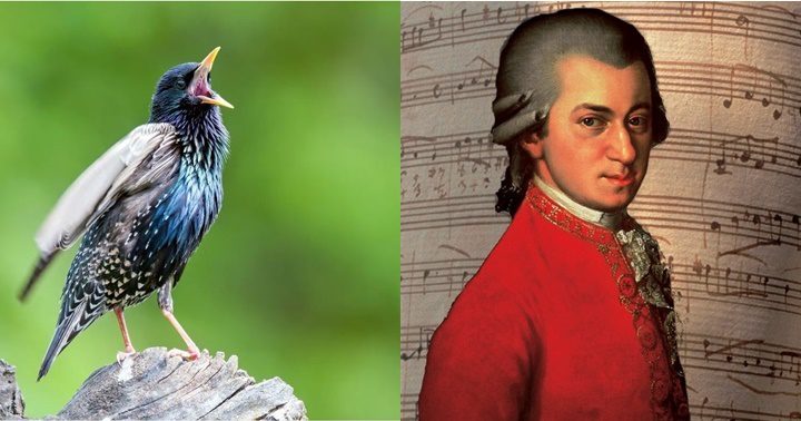 Un estornino canta, posado sobre un árbol. El compositor salzburgués adoptó a un estornino como mascota que influyó en sus obras.