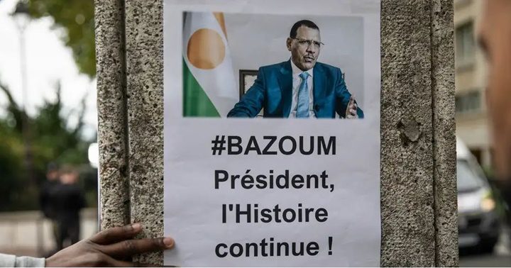 Cartel del presidente derrocado Mohamed Bazoum colgado en una pared frente a la embajada de Niger en París.