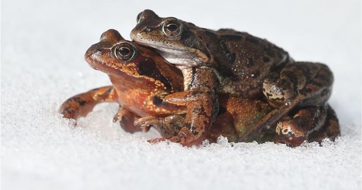 Dos ranas se mueven a través de la nieve hasta su zona de desove. Generalmente las hembras cargan a los machos sobre sus espaldas. Un estudio revela las estrategias de supervivencia en esta especie ante las violentas tácticas de reproducción de los machos.