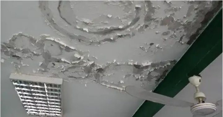 En una publicación en la red social X de @UrbinaJannett, está una fotografía donde se observa la parte interior del techo esconchada, como consecuencia del agua de lluvia que penetra por alguna ranura que se ha formado.