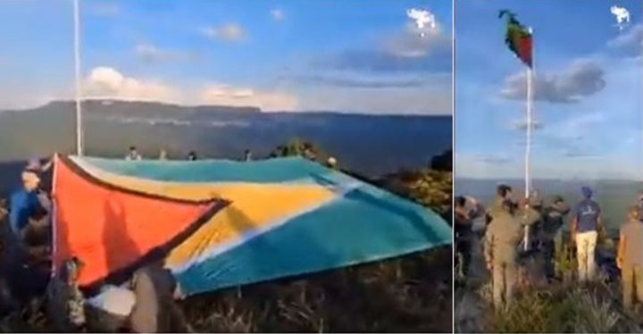 Este viernes, el presidente de Guyana, Irfaan Ali izó la bandera de su país en una montaña de 670 metros de altura en la Serranía de Pacaraima, territorio Esequibo.