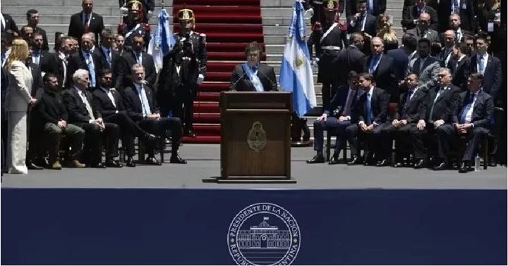 Milei habló en las afueras del Congreso, frente a la Plaza, rodeado de presidentes y líderes de todo el mundo que llegaron a la Argentina para participar de los actos protocolares de asunción. Fueron 34 minutos y en un clima casi de verano, con sol radiante y 26 grados de temperatura.