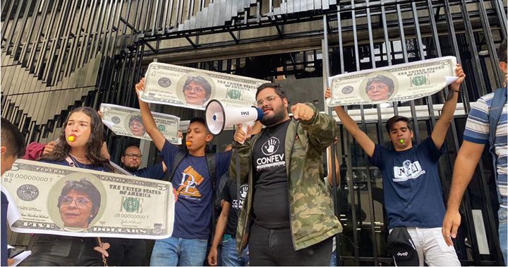 Vinimos con la miseria de $5 que nos da de beca la ministra Sandra Oblitas, este es el difraz que nos colocamos (…) Aunque arranquen los afiches vamos a venir al ministerio las veces que hagan falta. Venimos a exigirle que nos reciba, expuso Mendoza.