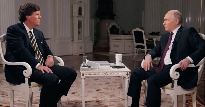 El presentador Tucker Carlson y Vladímir Putin, durante la entrevista transmitida este jueves 8-2-2024.