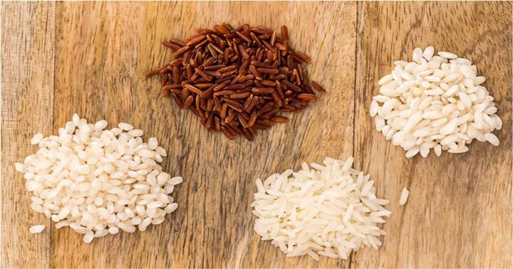 ¿Conviene lavar el arroz antes de cocinarlo? . Cuatro tipos diferentes de arroz sobre una tabla de madera de Italia, Francia, India y España.