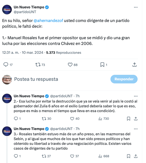 Un Nuevo Tiempo le respondió a Hernández en su cuenta de X. Señaló que “Manuel Rosales fue el primer opositor que se midió y dio una gran lucha por las elecciones contra Chávez en 2006”.
