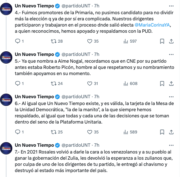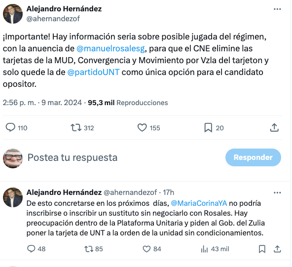 Alejandro Hernández, editor de la Gran Aldea, y Un Nuevo Tiempo, mantienen un careo en X (anterior Twitter) a raíz de unas publicaciones en las que se señala al partido de negociar para traicionar a la candidata opositora María Corina Machado, de cara a las elecciones presidenciales en Venezuela.