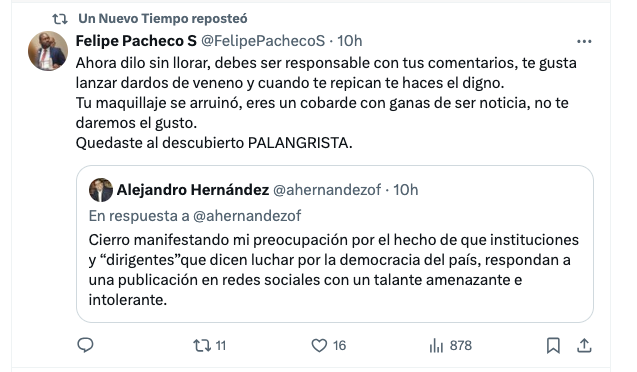 Felipe Pacheco, secretario ejecutivo nacional de Un Nuevo Tiempo, le señaló a Hernández que debía ser responsable con sus comentarios. “Te gusta lanzar dardos de veneno y cuando te repican te haces el digno. Tu maquillaje se arruinó, eres un cobarde con ganas de ser noticia, no te daremos el gusto. Quedaste al descubierto, palangrista”, indicó.