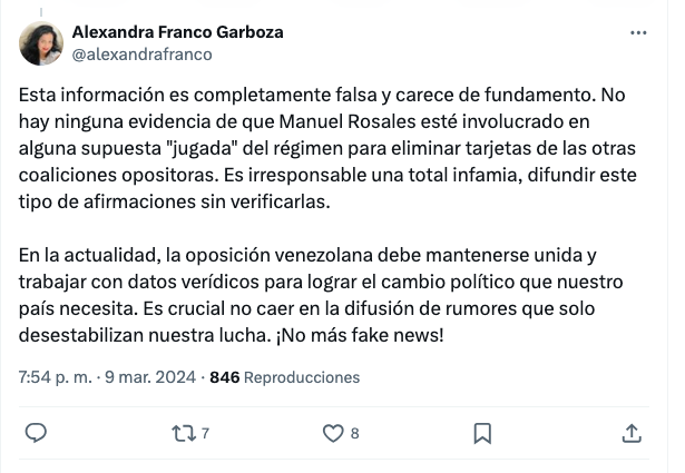 Para Alexandra Franco Garboza, secretaria política de Un Nuevo Tiempo en el exilio, la información es falsa y carece de fundamento. “No hay ninguna evidencia de que Manuel Rosales esté involucrado en alguna supuesta jugada del régimen para eliminar tarjetas de las otras coaliciones opositoras. Es irresponsable, una total infamia, difundir este tipo de afirmaciones sin verificarlas”, dijo.