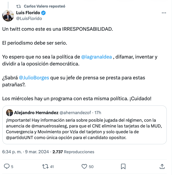 Luis Florido, por su parte, reclamó seriedad y responsabilidad. Yo espero que no sea política de La Gran Aldea difamar, inventar y dividir a la oposición democrática. Y agregó: “¿Sabrá Julio Borges que su jefe de prensa se presta para estas patrañas?.