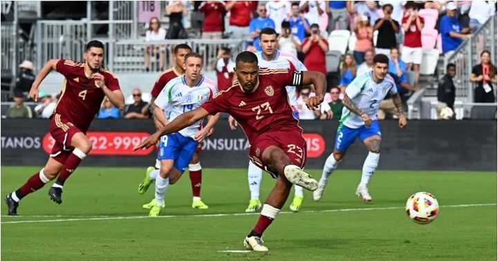 Salomón Rondón tuvo un par de ocasiones claras de cara al arco italiano, pero no pudo materializar ninguna, incluyendo el penalti. Sin embargo, la selección europea si aprovechó los errores venezolanos y tras una mala salida del portero Rafael Romo el balón le quedó servido a Mateo Retegui, quien marcó el 1-0 al 40′.