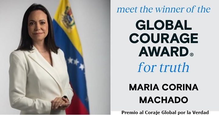 María Corina Machado ha sido distinguida con el inaugural «Premio al Coraje Global por la Verdad», otorgado por la organización «It Takes Courage». Este reconocimiento se le concede por su destacada valentía y su compromiso con la verdad y la libertad, en medio de la lucha contra el gobierno de Nicolás Maduro en Venezuela.