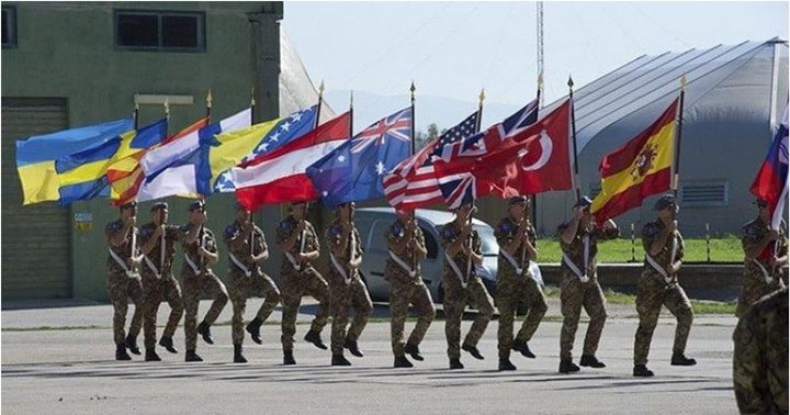Según Pekín, Washington se aferra a la mentalidad de la Guerra Fría y a las tácticas de juego de suma cero, formando clubes exclusivos. Desfile de banderas de la OTAN.